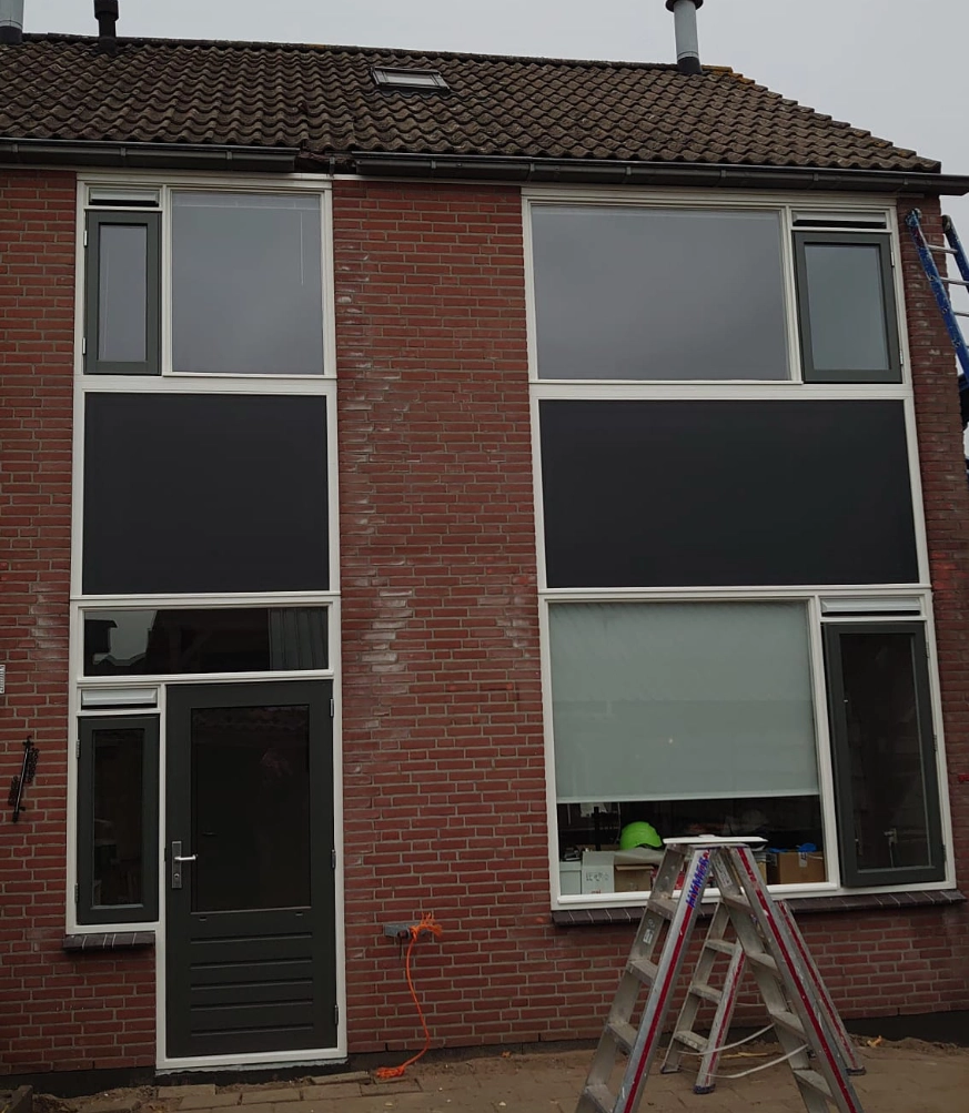 De combinatie van houten kozijnen in verkeerswit (RAL 9010) en draaiende delen in verkeersgrijs (RAL 7043) zorgt voor een fris contrast dat de architectonische lijnen van de rijwoningen benadrukt.